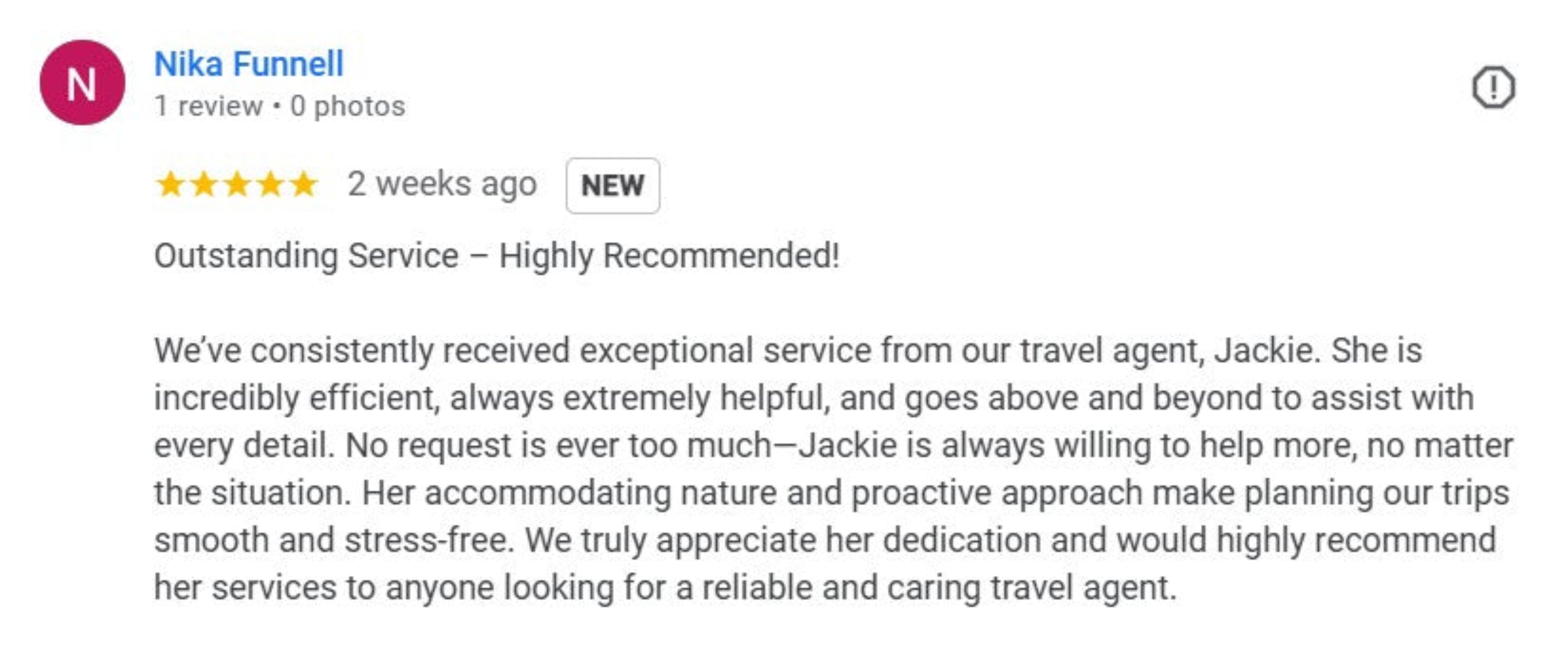 We’ve consistently received exceptional service from our travel agent, Jackie. She is incredibly efficient, always extremely helpful, and goes above and beyond to assist with every detail. No request is ever too much—Jackie is always willing to help more, no matter the situation. Her accommodating nature and proactive approach make planning our trips smooth and stress-free. We truly appreciate her dedication and would highly recommend her services to anyone looking for a reliable and caring travel agent. -